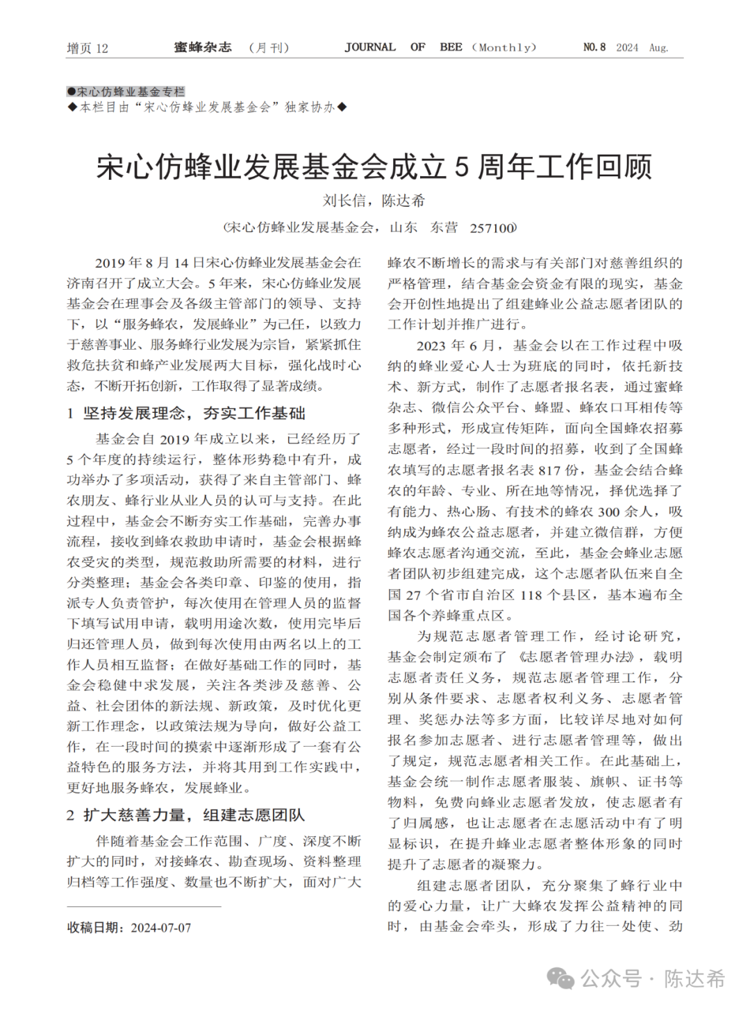 2019年8月14日宋心仿蜂业发展基金会在济南召开了成立大会。5年来,宋心仿蜂业发展基金会在理事会及各级主管部门的领导、支持下,以“服务蜂农,发展蜂业”为己任,以致力于慈善事业、服务蜂行业发展为宗旨,紧紧抓住救危扶贫和蜂产业发展两大目标,强化战时心态,不断开拓创新,工作取得了显著成绩。