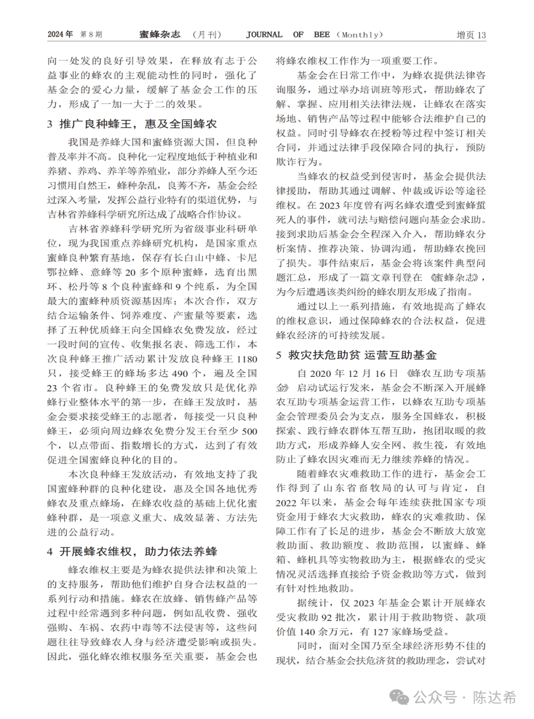 据统计,仅2023年基金会累计开展蜂农受灾救助92批次,累计用于救助物资、款项价值140余万元,有127家蜂场收益。